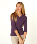 100% combed ring-spun cotton jersey • 5.5-oz. • top-stitched ribbed v-neck collar • taped neck • 3/4 sleeves • double-needle hemmed sleeves and bottom • softly shaped for a classic feminine fit • white is sewn with 100% cotton thread • Sizes: S-2XL